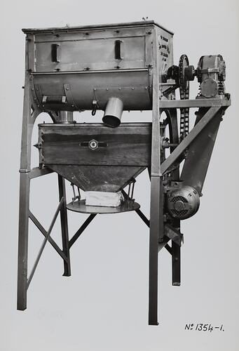 Hand written in black ink on front of photograph: 'No. 1354-1.' Printed in black ink on back of photograph: 'Kerr / BROS. / COMMERCIAL / PHOTOGRAPHERS / 533 COLLINS ST. MELBOURNE' Printed in black ink on back of photograph: 'SCHUMACHER MILL FURNISHING WORKS PTY. LTD. / GRAHAM ST. PORT MELBOURNE. / S. C. 7 VICTORIA. / TELEPHONE MX 2171' Printed in red ink on back of photograph: 'MIXER EQUIPMENT.'