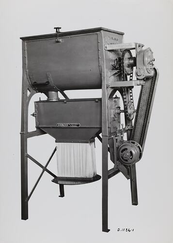 Black and white promotional image of a mixing and sifting machine. It is part of a collection of photographs and marked printer's copy used in the preparation of trade literature promoting products manufactured by the Schumacher Mill Furnishing Works Pty Ltd. The items were originally housed in a wooden filing drawer, with many filed by subject. This photograph was previously filed under 'With Sifter Under'.