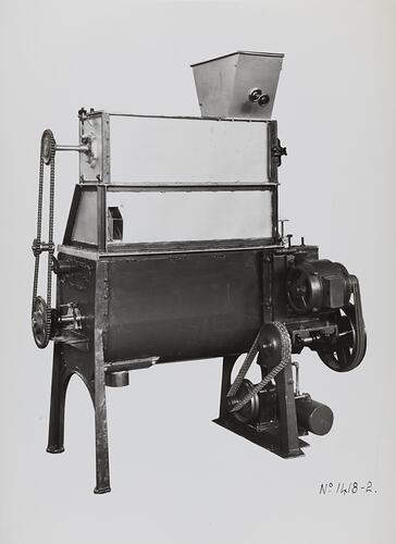 Black and white promotional image of a machine. It is part of a collection of photographs and marked printer's copy used in the preparation of trade literature promoting products manufactured by the Schumacher Mill Furnishing Works Pty Ltd. The items were originally housed in a wooden filing drawer, with many filed by subject. This photograph was previously filed under 'Small'.