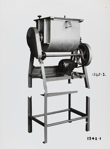Black and white promotional image of a machine. It is part of a collection of photographs and marked printer's copy used in the preparation of trade literature promoting products manufactured by the Schumacher Mill Furnishing Works Pty Ltd. The items were originally housed in a wooden filing drawer, with many filed by subject. This photograph was previously filed under 'Small'.