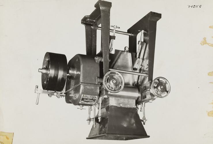 Printed in black ink on back of photograph: 'HIGH SPEED 2-ROLLER TYPE PAINT MILL...SIZE 14" x 9" x 7" / REFERENCE OR. 39293. / 15-20 galls per hour enamels and ordinary paint. / Gear Ratio 15.5 to 1. / Horsepower 5 HP / 225 back roll (large) take-off.' Printed in black ink on back of photograph: 'Kerr / BROS. / COMMERCIAL / PHOTOGRAPHERS / 533 COLLINS ST. MELBOURNE' Printed on the front of photograph: 'D.1121-1'