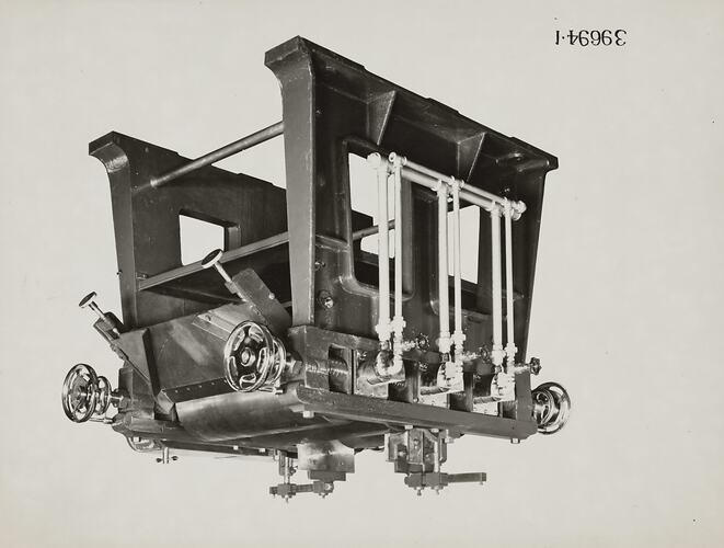 Black and white promotional image of a machine. It is part of a collection of photographs and marked printer's copy used in the preparation of trade literature promoting products manufactured by the Schumacher Mill Furnishing Works Pty Ltd. The items were originally housed in a wooden filing drawer, with many filed by subject. This photograph was previously filed under 'PAN'.