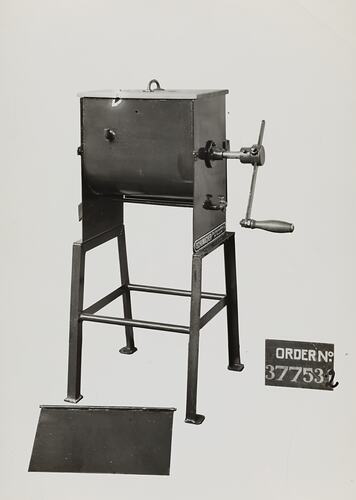 Printed in grey text on front of photograph: 'ORDER No. / 37753.2' Printed in black ink on back of photograph: 'Kerr / BROS. / COMMERCIAL / PHOTOGRAPHERS / 533 COLLINS ST. MELBOURNE' Printed in black ink on back of photograph: '10" x 15" WATER JACKETED MIXING MACHINE -- / SUPPLIED TO OR. 3 7 7 5 3 - dated 5/10/38' Printed in red ink on back of photograph: 'OFFICE COPY ONLY' Hand written in grey pencil on back of photograph: '15 / No' Hand written in black ink on back of photograph: '59'