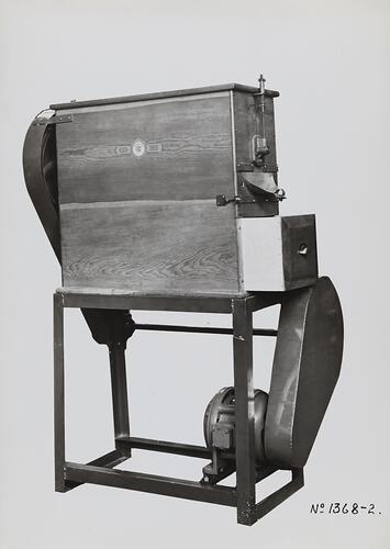 Printed in black on front of photograph: 'No. 1436-2.' Printed in black ink on back of photograph: 'Kerr / BROS. / COMMERCIAL / PHOTOGRAPHERS / 533 COLLINS ST. MELBOURNE' Printed in red ink on back of photograph: 'PHOTO FILE NO. / SECTION NO. / OFFICE COPY.' Printed in black ink on back of photograph: 'NO. 7 CABINET MIXER AND SIFTER ON ANGLE IRON STAND / WITH SMALL COUNTERSHAFT -- / SUPPLIED TO ORDER NO. 46019.' Hand written in grey pencil on back of photograph: '15 / No'