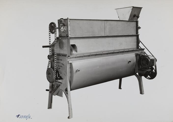 Printed in black on front of photograph: '#1388/2.' Printed in black ink on back of photograph: 'Kerr / BROS. / COMMERCIAL / PHOTOGRAPHERS / 533 COLLINS ST. MELBOURNE' Printed in red ink on back of photograph: 'PHOTO FILE NO. / SECTION NO. / OFFICE COPY.' Printed in black ink on back of photograph: 'REF. OR. 46410 -- STEAM JACKETED MIXER WITH / SIFTER, DRIVE AND EXHAUST (NO.14 MACHINE)' Hand written in grey pencil on back of photograph: '15 / yes'