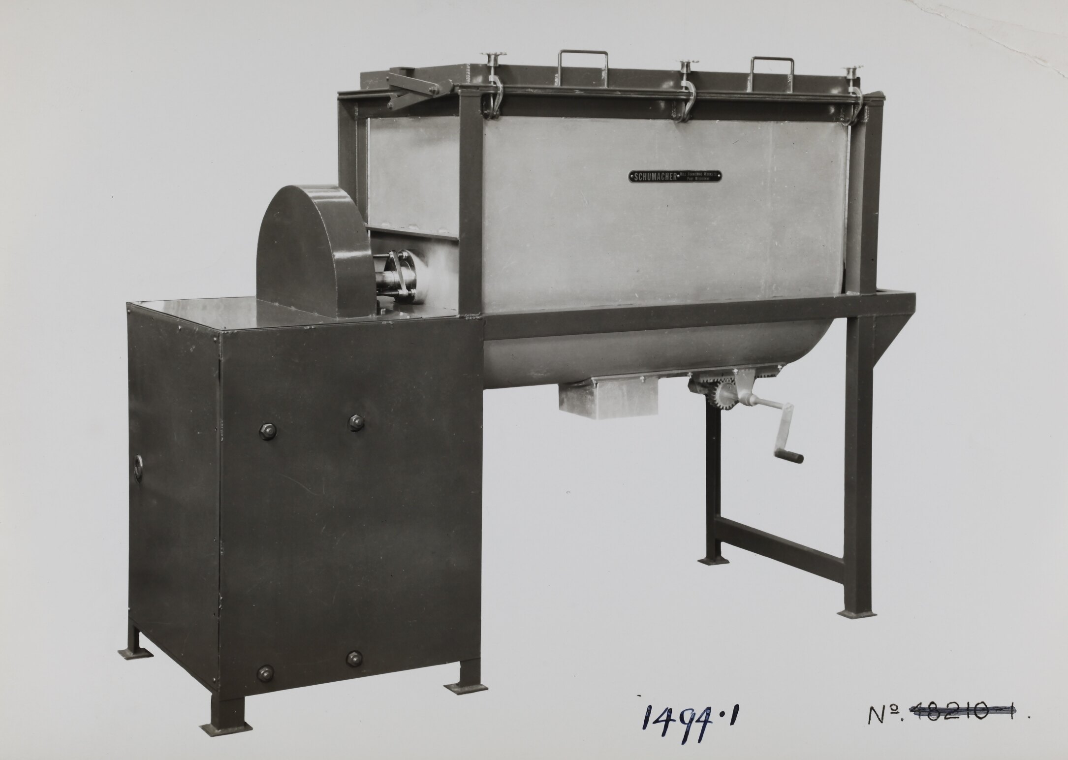 Printed in black on front of photograph: '1491-1 / No. 48210-1.[strikethrough]' Printed in black ink on back of photograph: 'Kerr / BROS. / COMMERCIAL / PHOTOGRAPHERS / 533 COLLINS ST. MELBOURNE' Printed in red ink on back of photograph: 'OFFICE COPY' Printed in black ink on back of photograph: 'No. 11 Mixer, no sifter, motor driven, / with leg extensions. Timber screen frame / to fit in top of Mixer. / ORDER 48291.'