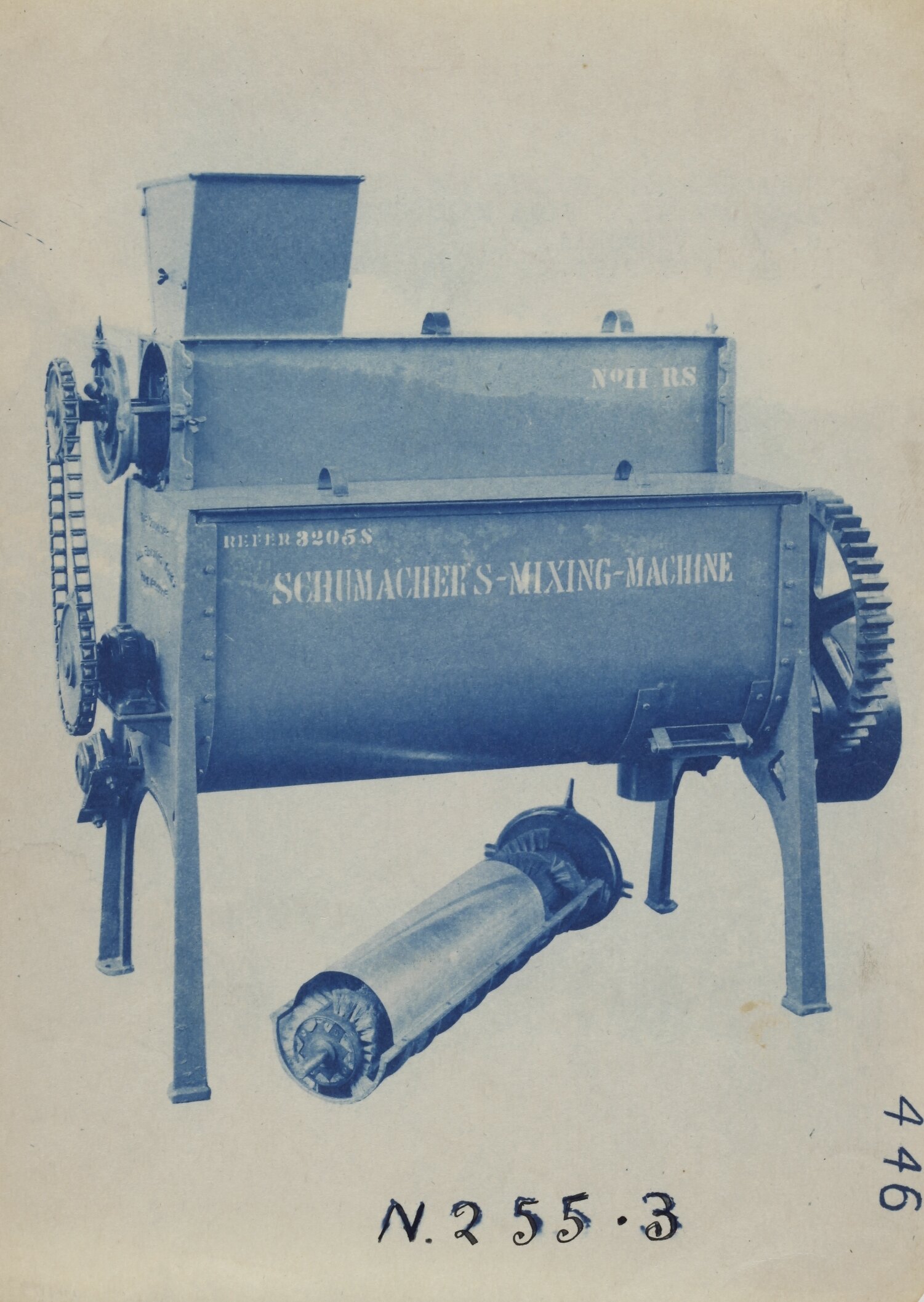 Cyanotype promotional image of a mixing machine. It is part of a collection of photographs and marked printer's copy used in the preparation of trade literature promoting products manufactured by the Schumacher Mill Furnishing Works Pty Ltd. The items were originally housed in a wooden filing drawer, with many filed by subject. This photograph was previously filed under 'Small'.