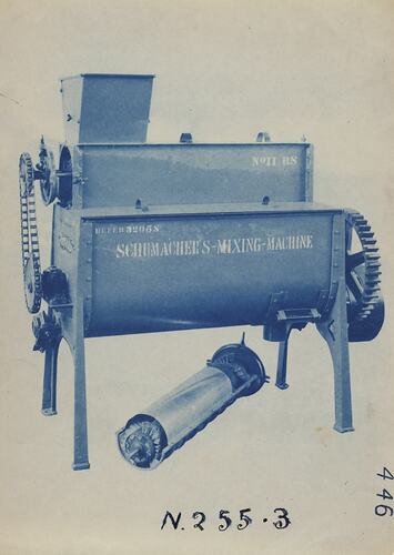 Printed in blue on front of photograph: '446' Printed in black on front of photograph: 'N.255-3' Printed in black ink on back of photograph: 'SCHUMACHER MILL FURNISHING WORKS PTY. LTD. / GRAHAM ST. PORT MELBOURNE. / S. C. 7 VICTORIA. / TELEPHONE MX 2171' Printed in red ink on back of photograph: 'MIXING EQUIPMENT' Hand written in grey pencil on back of photograph: '32058 Stock'