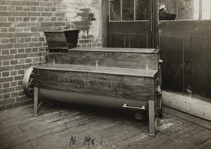 Black and white image depicting a factory interior with a mixing machine. It is part of a collection of photographs and marked printer's copy used in the preparation of trade literature promoting products manufactured by the Schumacher Mill Furnishing Works Pty Ltd. The items were originally housed in a wooden filing drawer, with many filed by subject. This photograph was previously filed under 'Small'.