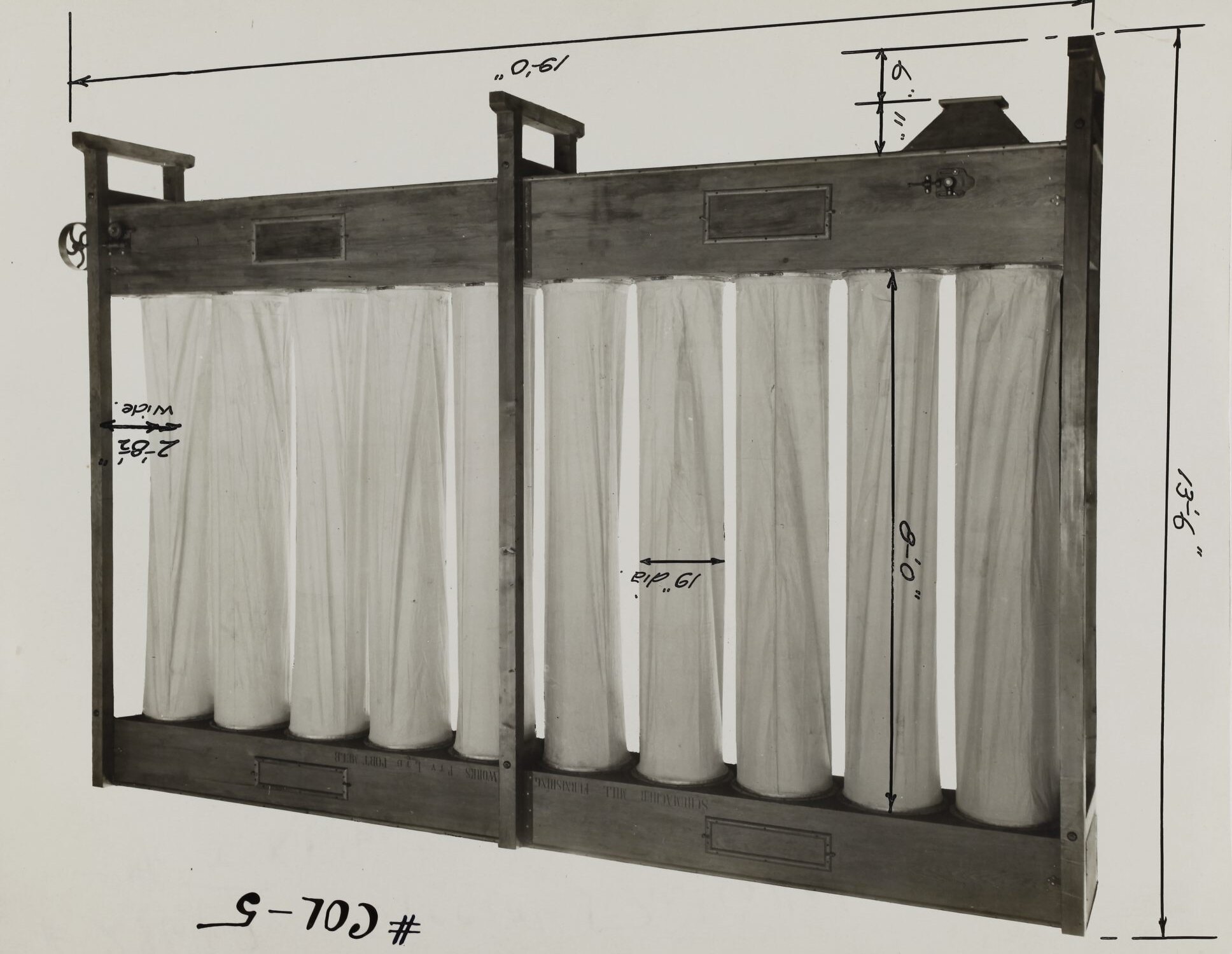 Handwritten in black ink on the front of photograph: '# COL-5 / 13-6" / 8-0" / 6" 11" / 19" dia / 2-8 1/2" / wide. / 19-0"' Handwritten in grey pencil on the back of photograph: '2' Handwritten in red pencil on the back of photograph: 'OFFICE COPY' Handwritten in black ink on the back of photograph: '#28679 / special Dust Collector / A/C J. Kitchen & Sons, P. Melbourne. / 23.12.29. / Sleeves 10 - 8'4" x 19" diam. / 5' Printed in red ink on the back of photograph: 'PHOTO FILE NO. / SECTION NO.' Printed in purple ink on the back of photograph: 'Commercial / Photographers / Kerr Bros'