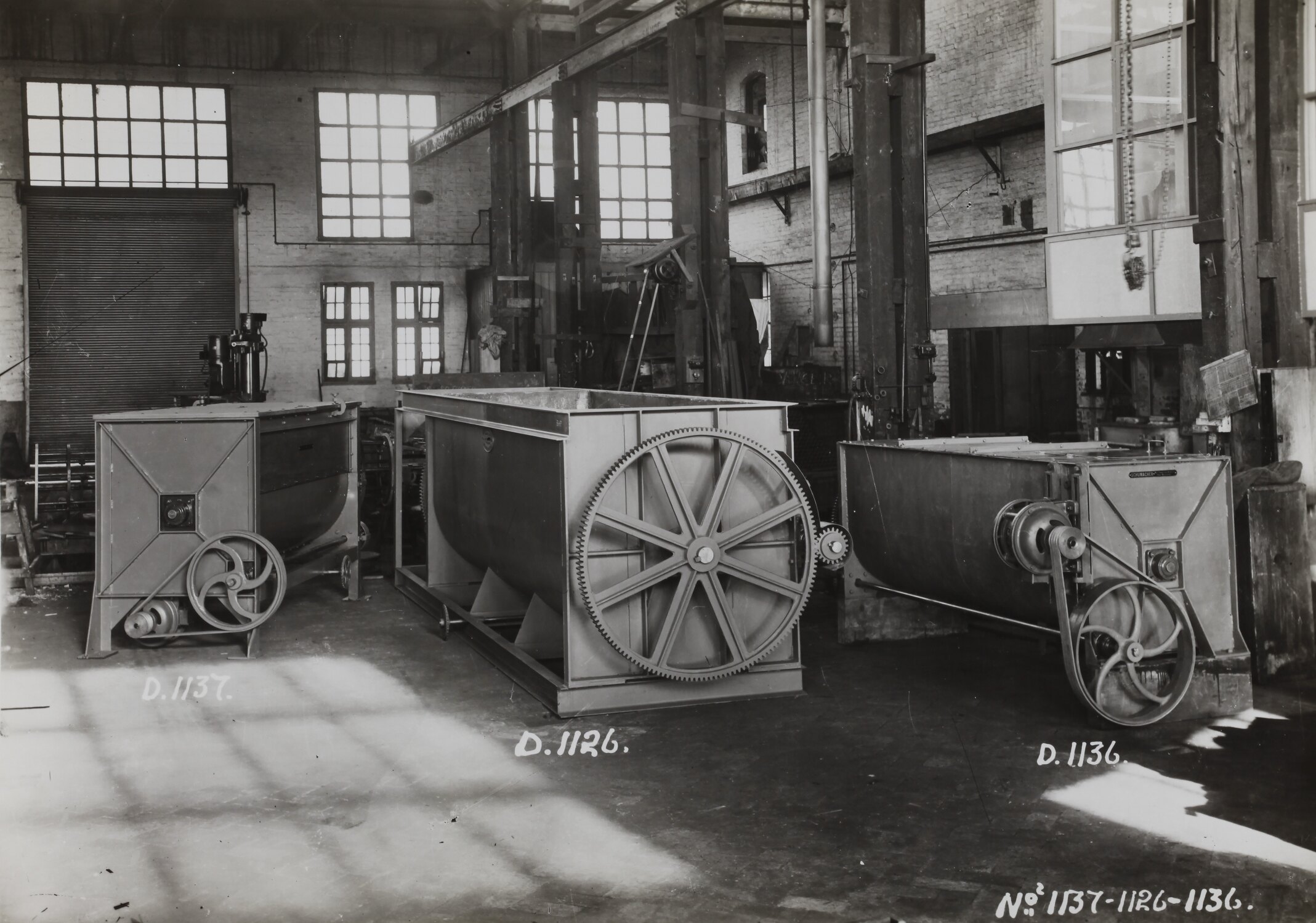 Black and white image depicting three mixing machines. It is part of a collection of photographs and marked printer's copy used in the preparation of trade literature promoting products manufactured by the Schumacher Mill Furnishing Works Pty Ltd. The items were originally housed in a wooden filing drawer, with many filed by subject. This photograph was previously filed under 'Large'.