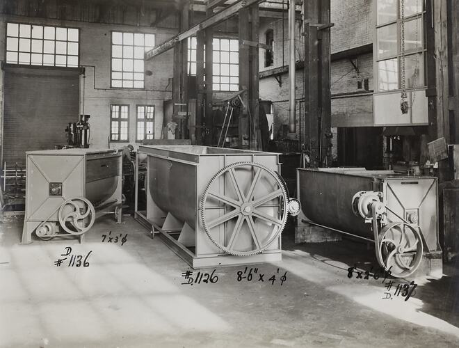 Black and white image depicting three mixing machines. It is part of a collection of photographs and marked printer's copy used in the preparation of trade literature promoting products manufactured by the Schumacher Mill Furnishing Works Pty Ltd. The items were originally housed in a wooden filing drawer, with many filed by subject. This photograph was previously filed under 'Large'.