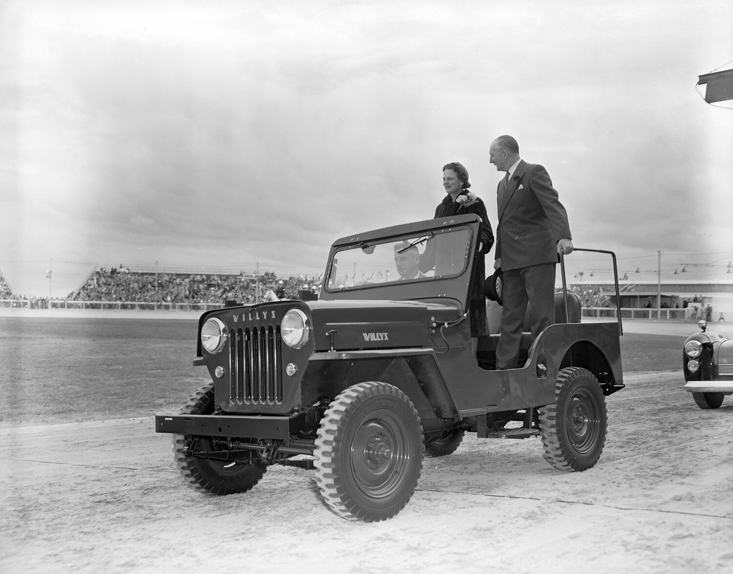 A man and a woman stand in the back of a car on parade at the Royal Melbourne Show.