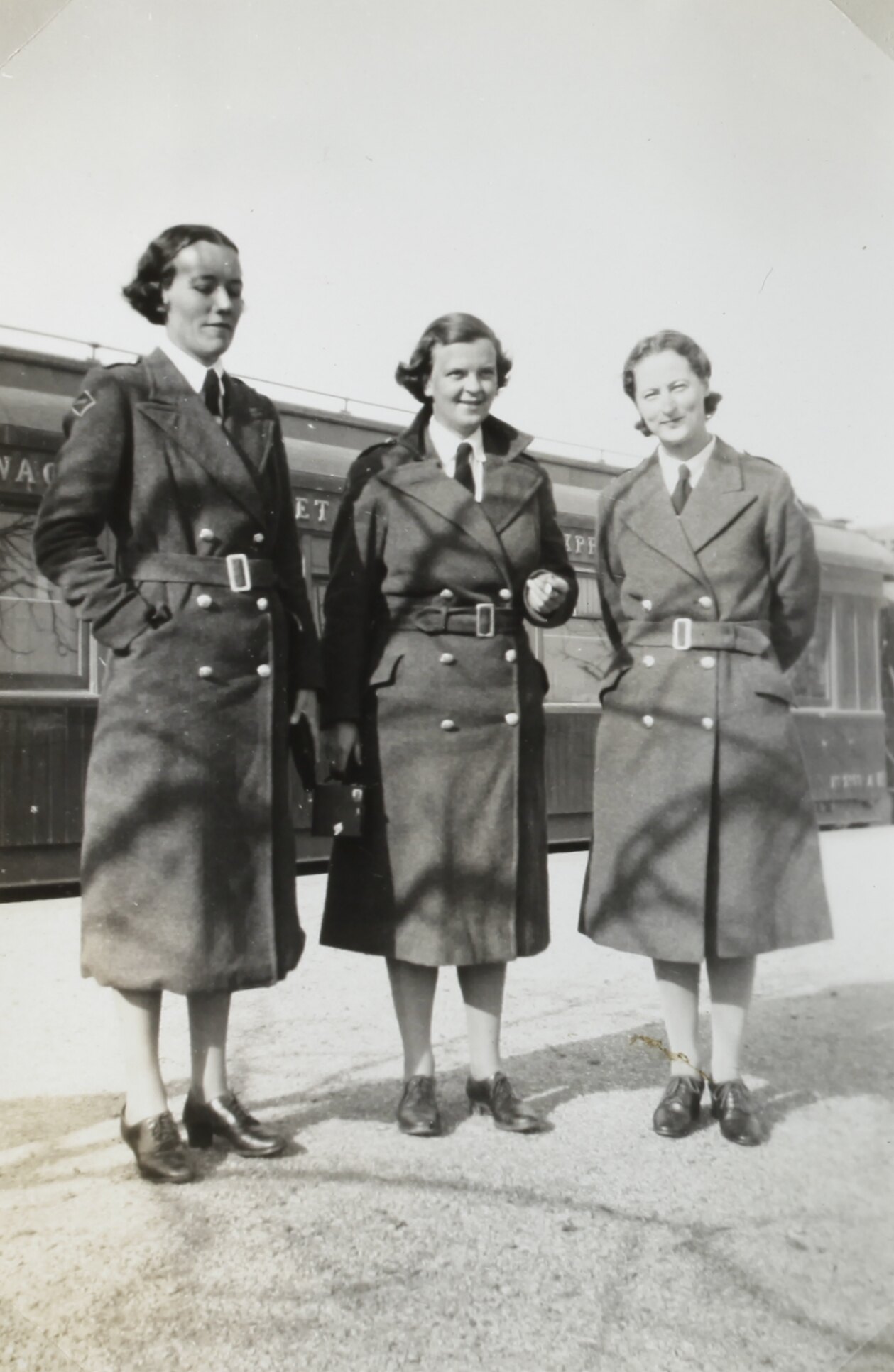 Portrait of three women in military uniform. The woman in the middle is holding a camera.