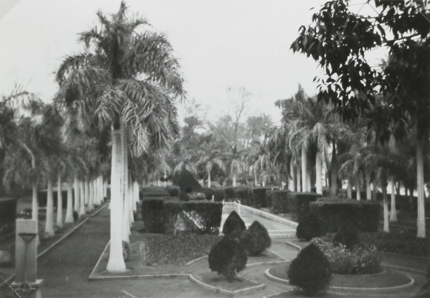 Garden landscape showing paths, palm trees and a water feature.