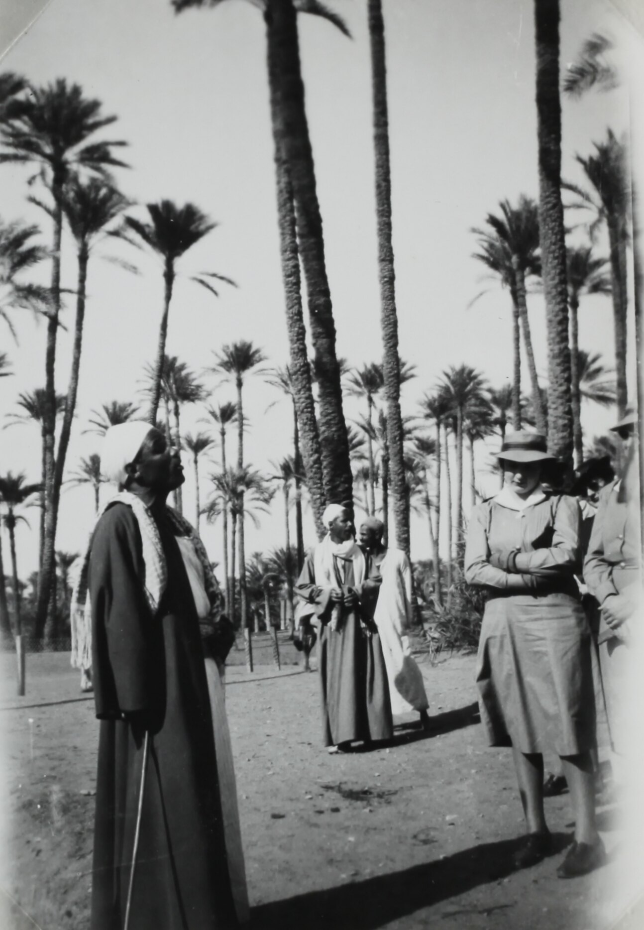 A group of women in military uniform and an Eqyptian man standing amongst palm trees in Memphis, Egypt.