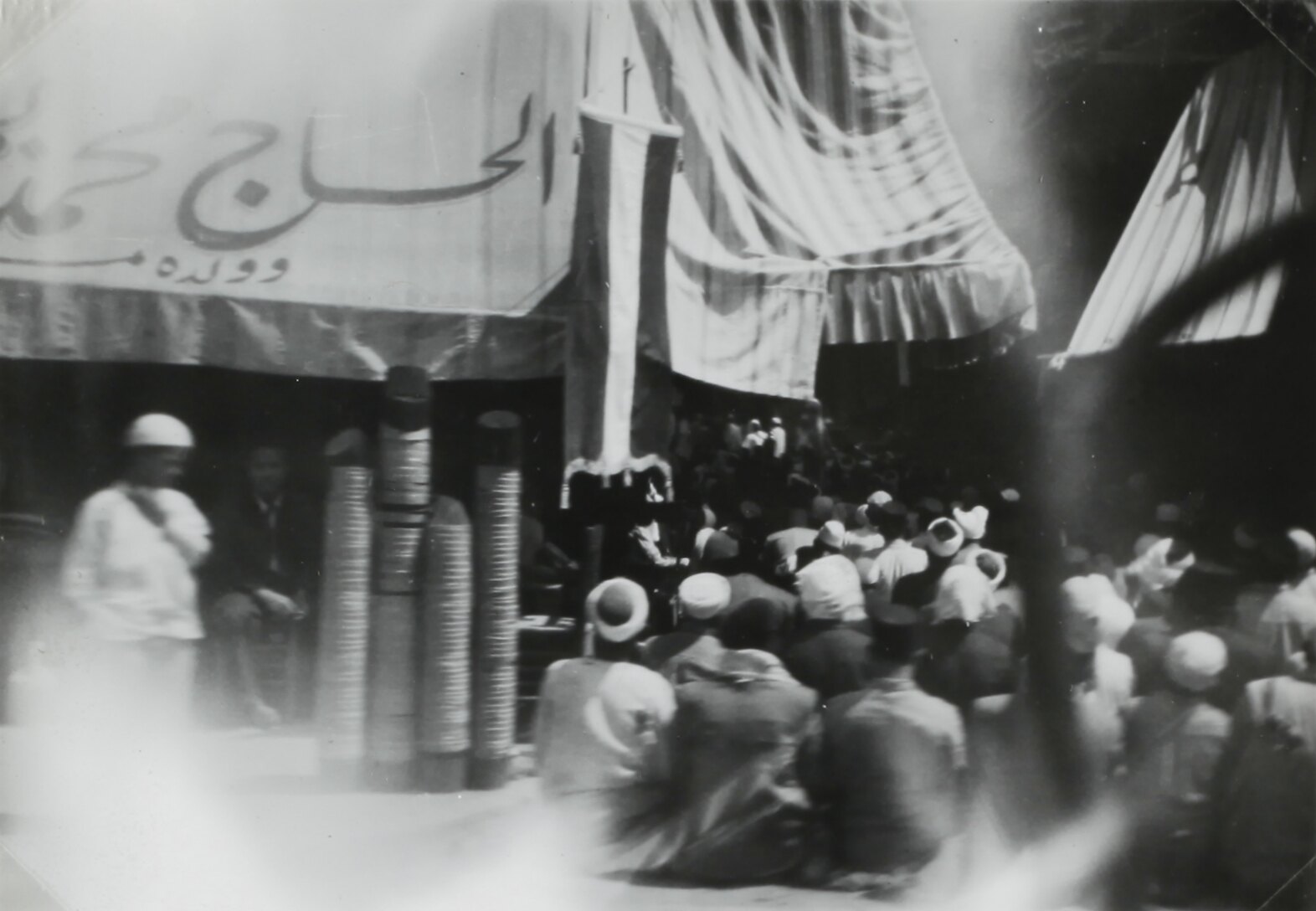 Hand written in white ink on album page below photograph: 'PRAYING. CAIRO' Hand written in grey pencil on back of photograph: '2' Printed in black ink on back of photograph: 'Velox[repeated]'