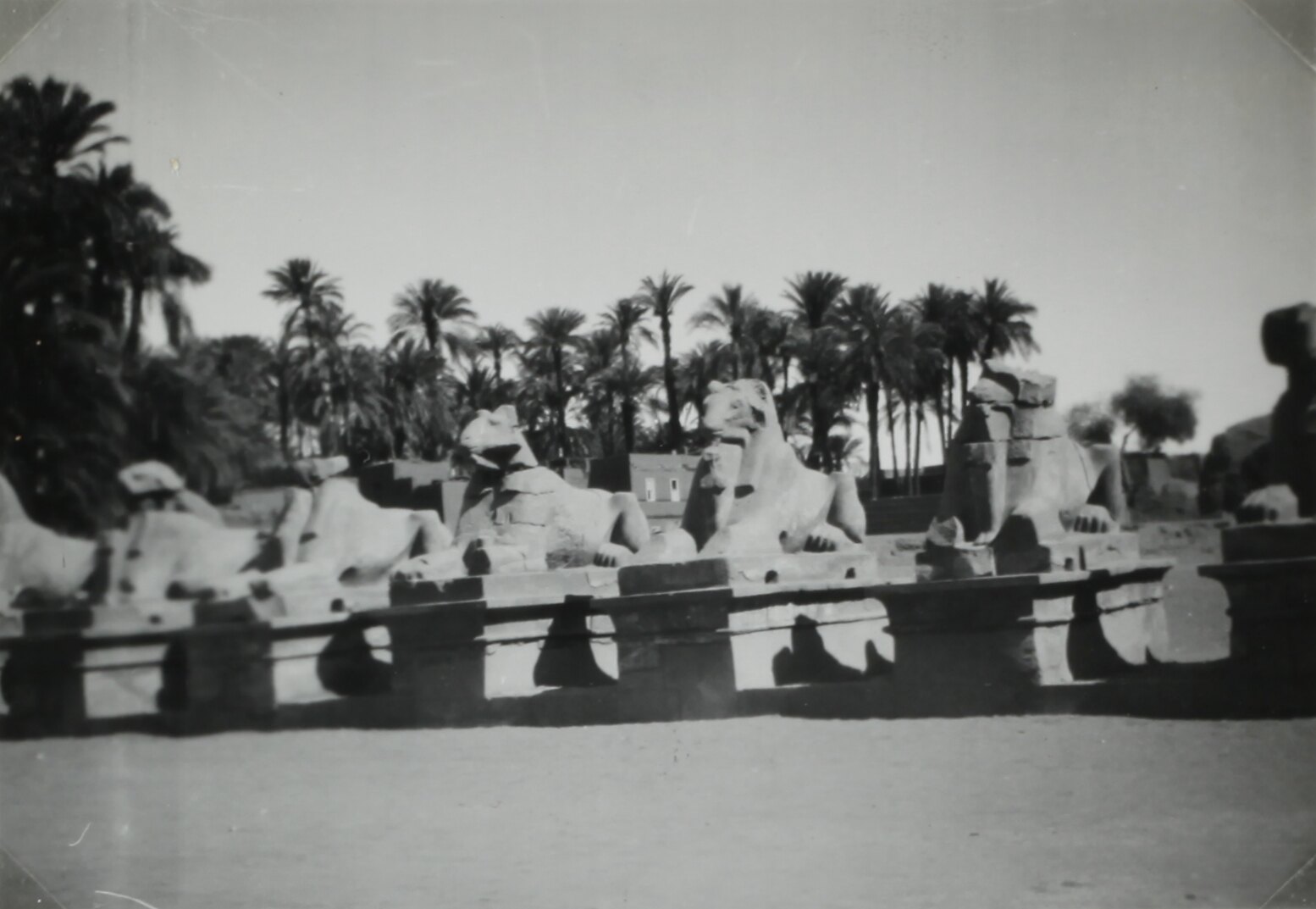 Entrance to the Karnak Temple, showing an avenue of ram-headed sphinxes with palm trees in the background.