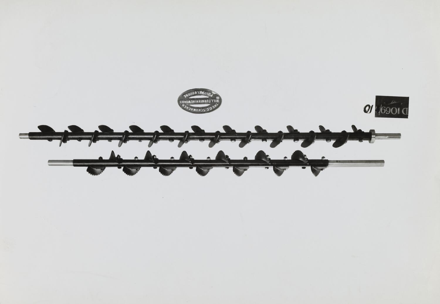 Printed on the front of photograph: 'D.1069-10' Handwritten in black ink on the back of photograph: '18' Handwritten in grey pencil on the back of photograph: '3-C' Printed in red ink on the back of photograph: 'OFFICE COPY ONLY' Printed in purple ink on the back of photograph: 'Kerr / BROS. / COMMERCIAL / PHOTOGRAPHERS / 533 COLLINS ST. MELBOURNE / PHOTO FILE NO. / SECTION' Printed in black ink on the back of photograph: 'PHOTO FILE NO / SECTION NO / 83 7/8" LONG SCREW CONVEYOR, SPECIAL TYPE / SUPPLIED TO OR 3 8 9 1 3 13/10/39'