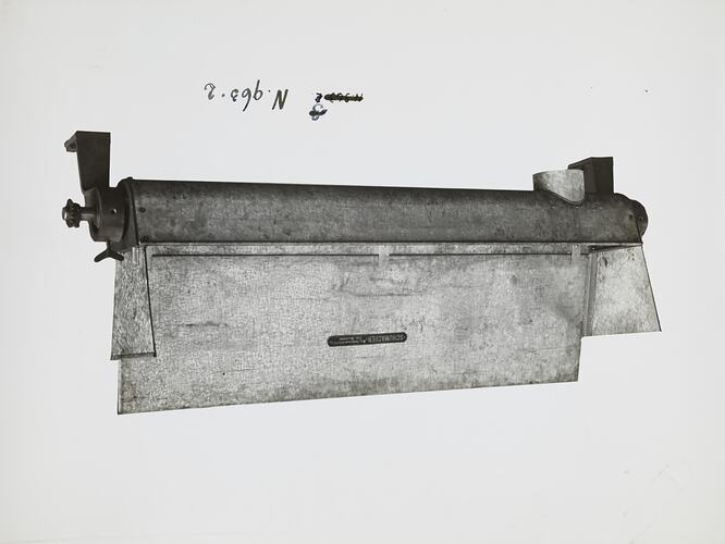 Handwritten in black ink on the front of photograph: 'N.963-2' Printed in red ink on the back of photograph: 'OFFICE COPY.' Printed in purple ink on the back of photograph: 'Kerr / BROS. / COMMERCIAL / PHOTOGRAPHERS / 533 COLLINS ST. MELBOURNE' Printed in black ink on the back of photograph: 'SCHUMACHER MILL FURNISHING WORKS PTY. LTD. / GRAHAM ST. PORT MELBOURNE. / S. C. 7 VICTORIA. / TELEPHONE MX 2171 / OR.33282 - MILK ROLL CONVEYORS FOR DIRECT CONNECITON / EACH SIDE OF MILK DRYING ROLL STAND, / 6' x 7"'