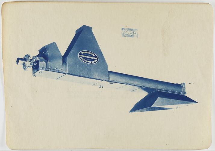 Cyanotype promotional image of a chomper screw. It is part of a collection of photographs and marked printer's copy used in the preparation of trade literature promoting products manufactured by the Schumacher Mill Furnishing Works Pty Ltd. The items were originally housed in a wooden filing drawer, with many filed by subject. This photograph was previously filed under 'BELT'.