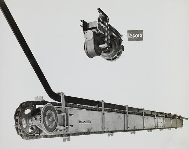 Black and white promotional image of a carcass elevator. It is part of a collection of photographs and marked printer's copy used in the preparation of trade literature promoting products manufactured by the Schumacher Mill Furnishing Works Pty Ltd. The items were originally housed in a wooden filing drawer, with many filed by subject. This photograph was previously filed under 'LIVE ROLL'.