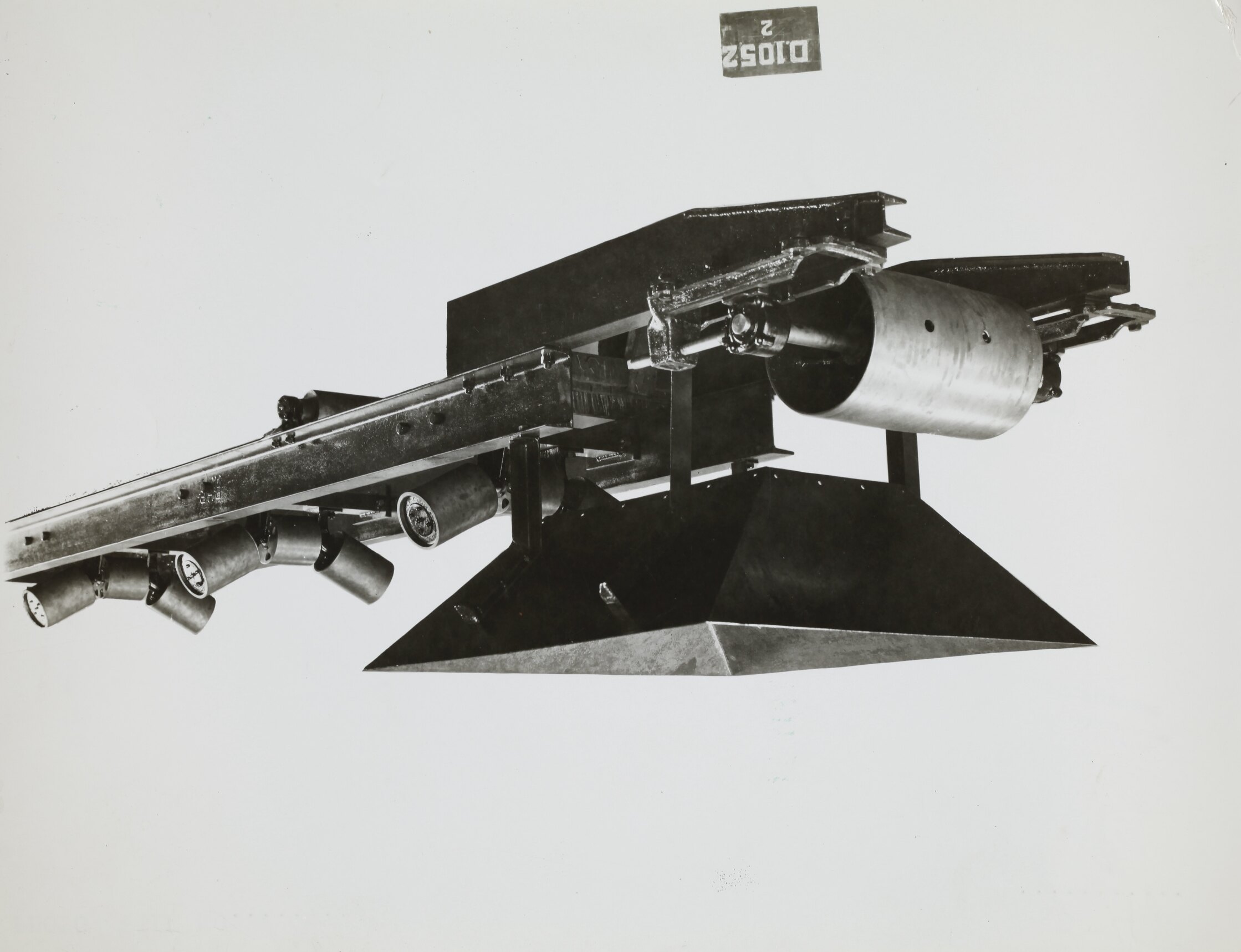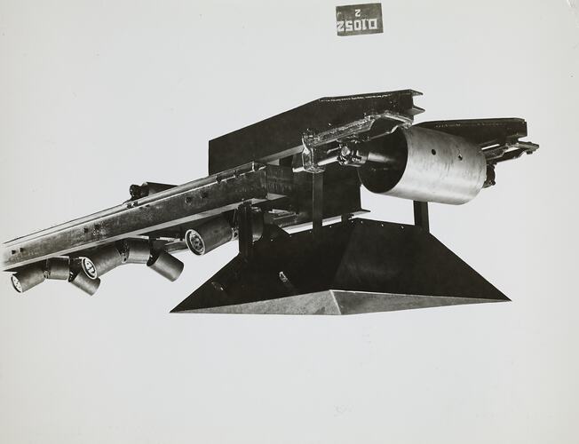 Printed on the front of photograph: 'D.1052-2' Handwritten in grey pencil on the back of photograph: '3-A' Handwritten in black ink on the back of photograph: '18' Printed in red ink on the back of photograph: 'OFFICE COPY ONLY' Printed in black ink on the back of photograph: 'PHOTO FILE NO / SECTION NO / 44' CENTRES LIGHT PORTABLE CONVEYOR (WITHOUT BELT) / SUPPLIED TO ORDER 3 6 5 1 2 dated 6/10/37' Printed in purple ink on the back of photograph: 'Kerr / BROS. / COMMERCIAL / PHOTOGRAPHERS / 533 COLLINS ST. MELBOURNE' Printed in green ink on the back of photograph: 'SCHUMACHER MILL FURNISHING WORKS PTY. LTD.'