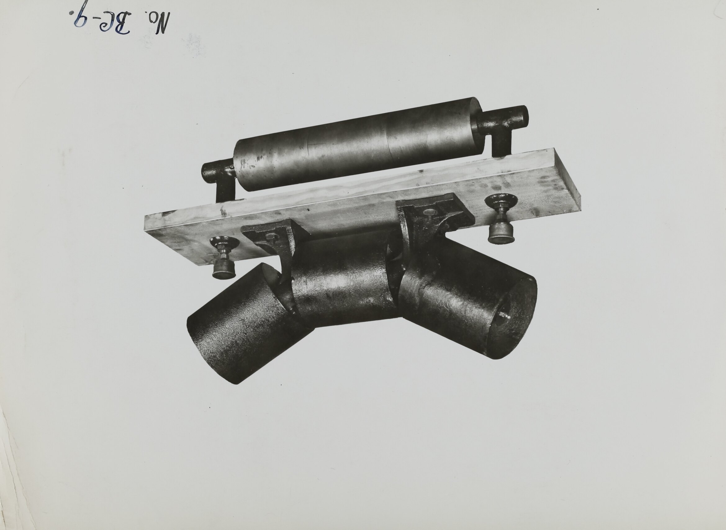 Black and white promotional image of a machinery component. It is part of a collection of photographs and marked printer's copy used in the preparation of trade literature promoting products manufactured by the Schumacher Mill Furnishing Works Pty Ltd. The items were originally housed in a wooden filing drawer, with many filed by subject. This photograph was previously filed under 'PORTABLE'.