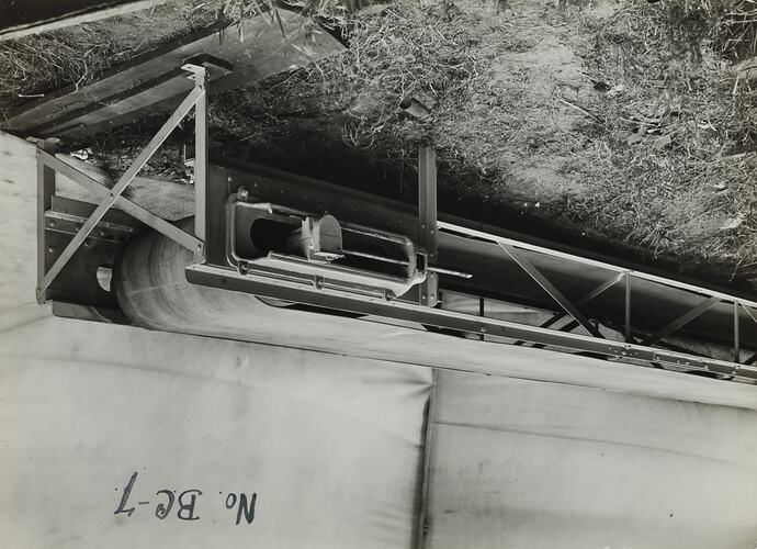 Black and white promotional image of a conveyor in a factory. It is part of a collection of photographs and marked printer's copy used in the preparation of trade literature promoting products manufactured by the Schumacher Mill Furnishing Works Pty Ltd. The items were originally housed in a wooden filing drawer, with many filed by subject. This photograph was previously filed under 'PORTABLE'.