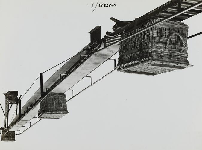 Black and white promotional image of a roller conveyor carrying baskets. It is part of a collection of photographs and marked printer's copy used in the preparation of trade literature promoting products manufactured by the Schumacher Mill Furnishing Works Pty Ltd. The items were originally housed in a wooden filing drawer, with many filed by subject. This photograph was previously filed under 'PORTABLE'.
