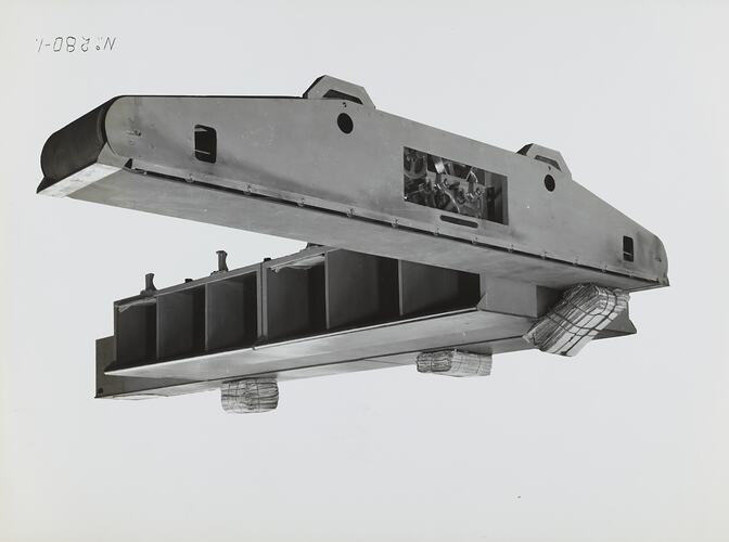 Black and white promotional image of a conveyor. It is part of a collection of photographs and marked printer's copy used in the preparation of trade literature promoting products manufactured by the Schumacher Mill Furnishing Works Pty Ltd. The items were originally housed in a wooden filing drawer, with many filed by subject. This photograph was previously filed under 'PORTABLE'.