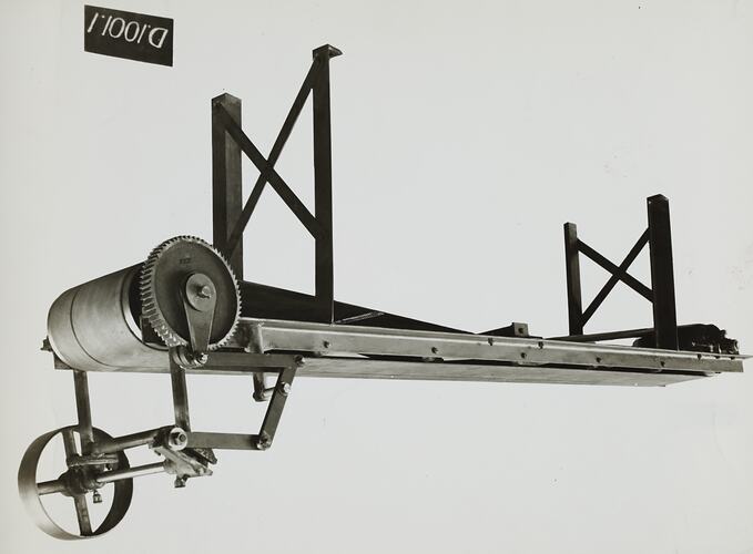 Black and white promotional image of a conveyor. It is part of a collection of photographs and marked printer's copy used in the preparation of trade literature promoting products manufactured by the Schumacher Mill Furnishing Works Pty Ltd. The items were originally housed in a wooden filing drawer, with many filed by subject. This photograph was previously filed under 'PORTABLE'.