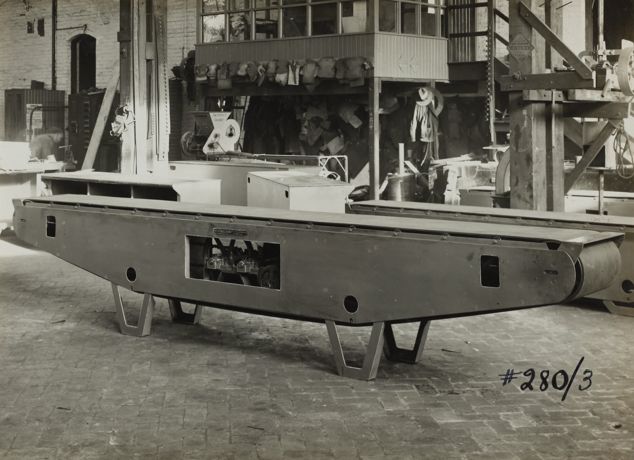 Black and white promotional image of conveyors. It is part of a collection of photographs and marked printer's copy used in the preparation of trade literature promoting products manufactured by the Schumacher Mill Furnishing Works Pty Ltd. The items were originally housed in a wooden filing drawer, with many filed by subject. This photograph was previously filed under 'LAYOUTS'.