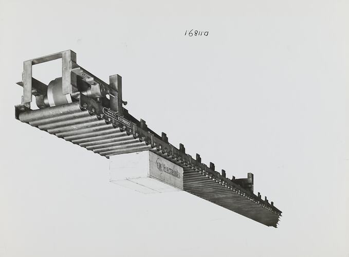 Black and white promotional image of a motor driven roller conveyor. It is part of a collection of photographs and marked printer's copy used in the preparation of trade literature promoting products manufactured by the Schumacher Mill Furnishing Works Pty Ltd. The items were originally housed in a wooden filing drawer, with many filed by subject. This photograph was previously filed under 'LAYOUTS'.