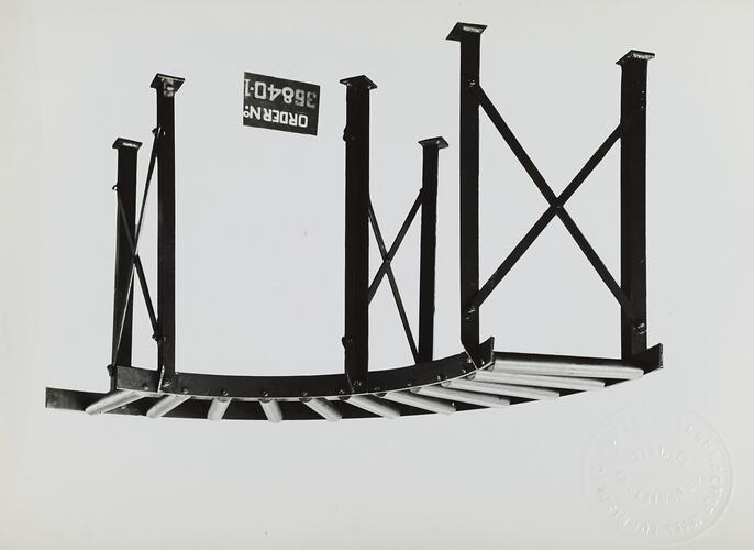 Printed on the front of image: 'ORDER No. / 36840-1' Embossed on the front of photograph: 'SCHUMACHER MILL FURNISHING WORKS/ PROPIETARY / LIMITED' Handwritten in black ink on the back of photograph: '35.' Printed in black ink on back of photograph: 'GRAVITY ROLLER CONVEYOR CURVE WITH STANDS - - - / SUPPLIED TO ORDER 36840 6/1/38. / SCHUMACHER MILL FURNISHING WORKS PTY. LTD. / GRAHAM ST. PORT MELBOURNE. / S. C. 7 VICTORIA. / TELEPHONE MX 2171' Printed in purple ink on back of photograph: 'Kerr / BROS. / COMMERCIAL / PHOTOGRAPHERS / 533 COLLINS ST. MELBOURNE' Printed in red ink on back of photograph: 'OFFICE COPY.'