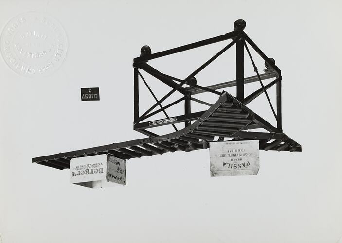 Black and white promotional image of a curve on a travelling carriage. It is part of a collection of photographs and marked printer's copy used in the preparation of trade literature promoting products manufactured by the Schumacher Mill Furnishing Works Pty Ltd. The items were originally housed in a wooden filing drawer, with many filed by subject. This photograph was previously filed under 'LAYOUTS'.