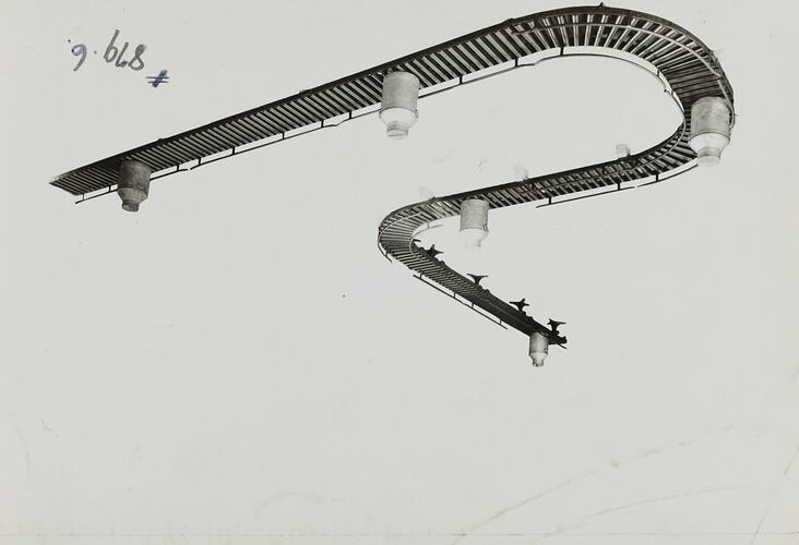 Black and white promotional image of a conveyor. It is part of a collection of photographs and marked printer's copy used in the preparation of trade literature promoting products manufactured by the Schumacher Mill Furnishing Works Pty Ltd. The items were originally housed in a wooden filing drawer, with many filed by subject. This photograph was previously filed under 'LAYOUTS'.