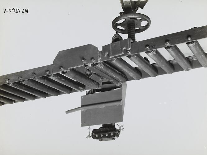Black and white promotional image of a conveyor. It is part of a collection of photographs and marked printer's copy used in the preparation of trade literature promoting products manufactured by the Schumacher Mill Furnishing Works Pty Ltd. The items were originally housed in a wooden filing drawer, with many filed by subject. This photograph was previously filed under 'LAYOUTS'.