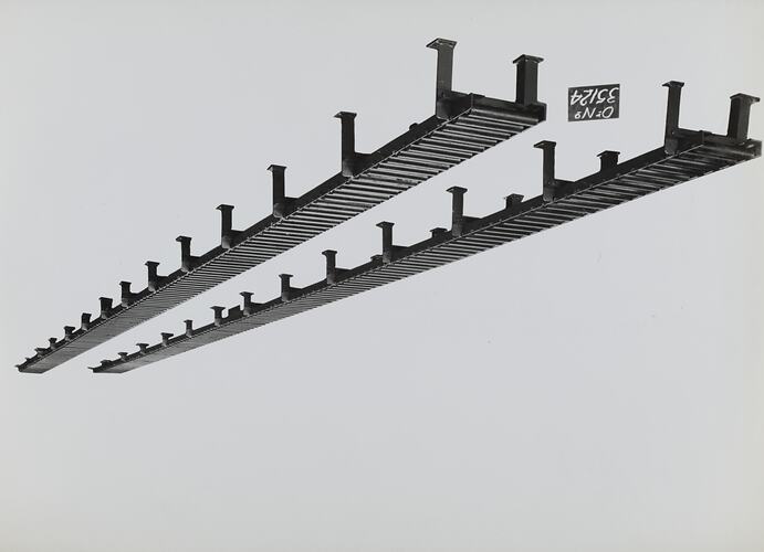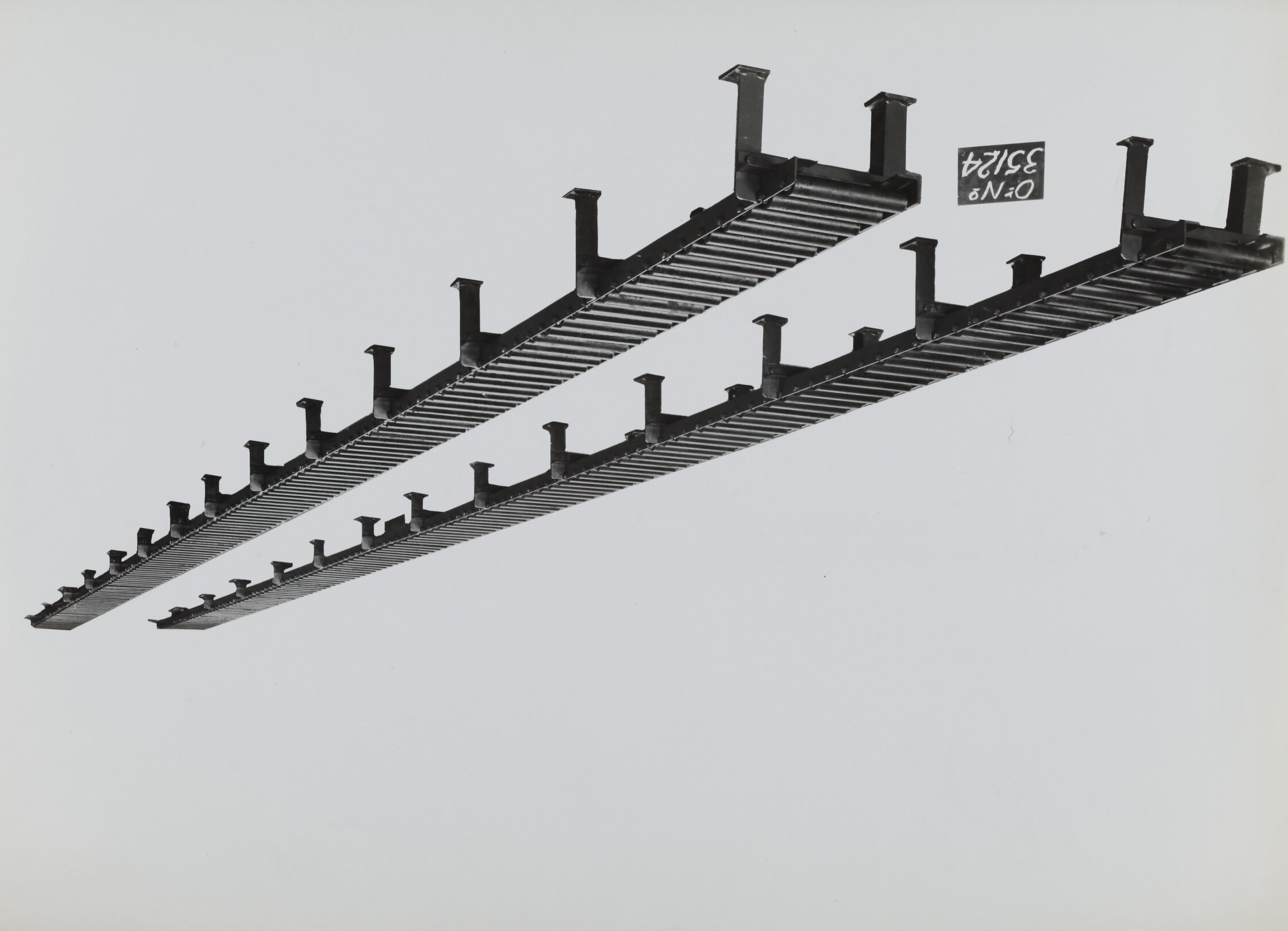 Black and white promotional image of a heavy duty roller conveyor for use in foundries. It is part of a collection of photographs and marked printer's copy used in the preparation of trade literature promoting products manufactured by the Schumacher Mill Furnishing Works Pty Ltd. The items were originally housed in a wooden filing drawer, with many filed by subject. This photograph was previously filed under 'LAYOUTS'.