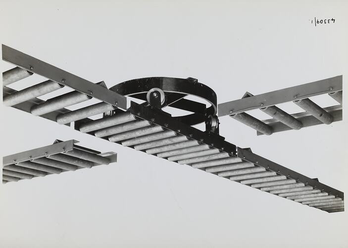 Black and white promotional image of a turntable conveyor. It is part of a collection of photographs and marked printer's copy used in the preparation of trade literature promoting products manufactured by the Schumacher Mill Furnishing Works Pty Ltd. The items were originally housed in a wooden filing drawer, with many filed by subject. This photograph was previously filed under 'LAYOUTS'.