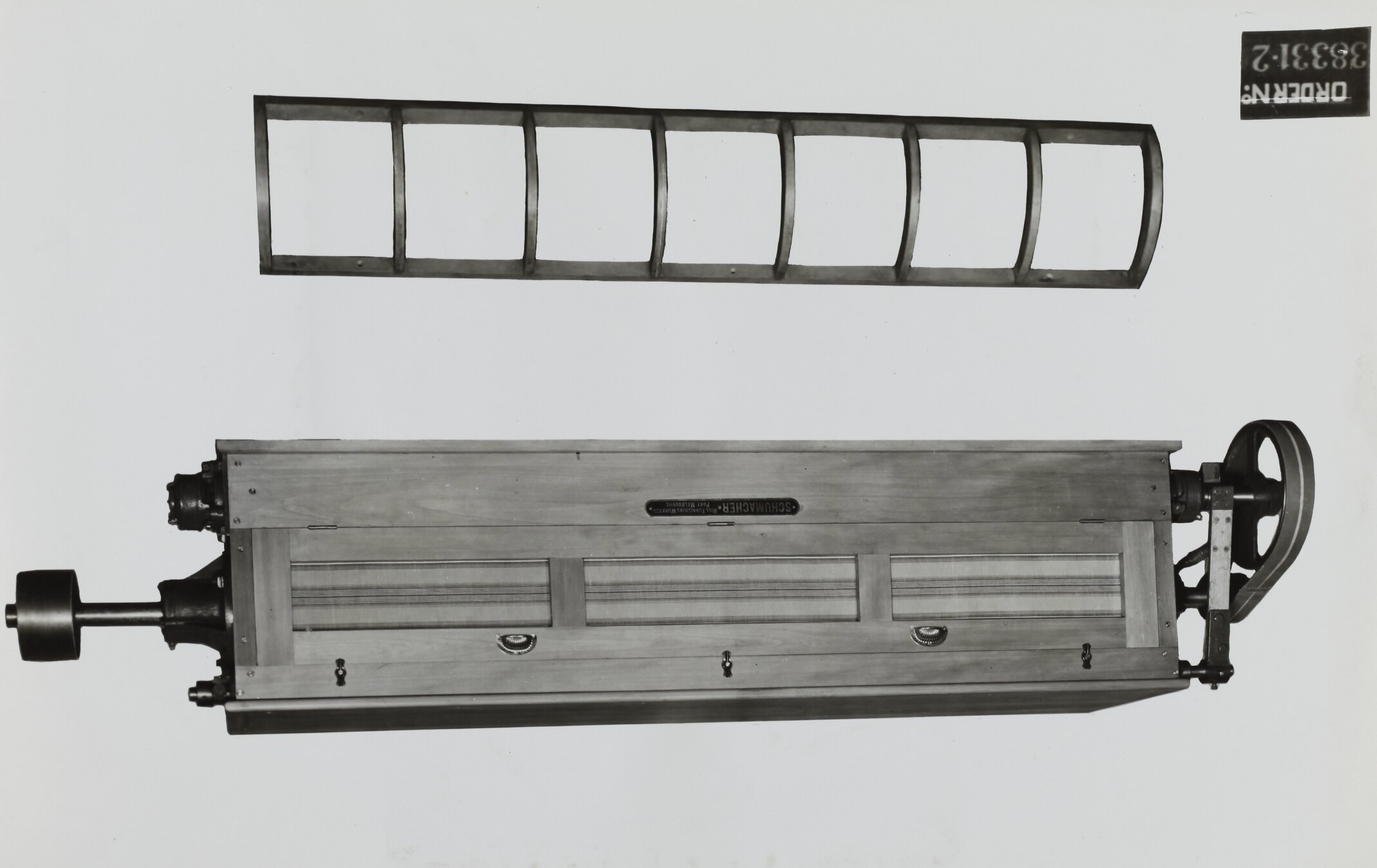 Printed on the front of image: 'ORDER No / 38331-2' Printed in purple ink on back of photograph: 'Kerr / BROS. / COMMERCIAL / PHOTOGRAPHERS / 533 COLLINS ST. MELBOURNE' Printed in black ink on cream label attached to back of photograph: 'Photo 38331.2 High-speed / "Whipper" type Dressing Machine / suitable for breaking up soft / flaky particles of material, / and for dressing fine posders. / O.N. 38331 - 29/3/39. / From / Schumacher Mill Furnishing Works / PROPRIETARY LIMITED. / NO. 6 ROTARY TYPE HORIZONTAL / SINGLE SIEVE SIFTER - / Supplied to : / COMMONWEALTH FERTILIZERS & / CHEMICALS LTD - CUMING SMITH / FCTY. YARRAVILLE. / PORT MELBOURNE, / VICTORIA.'