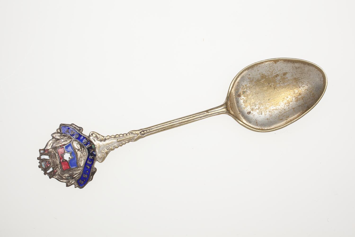 Small EPNS teaspoon decorated with the flag of the Aberdeen & Commonwealth Shipping Line and the ship's name SS Jervis Bay. The spoon was a first prize won by Daisy Poole in a fancy dress competition, she was dressed appropriately as a daisy, on board the SS Jervis Bay during a voyage from Australia to Britain in May-June 1938. She also received a small trophy goblet.