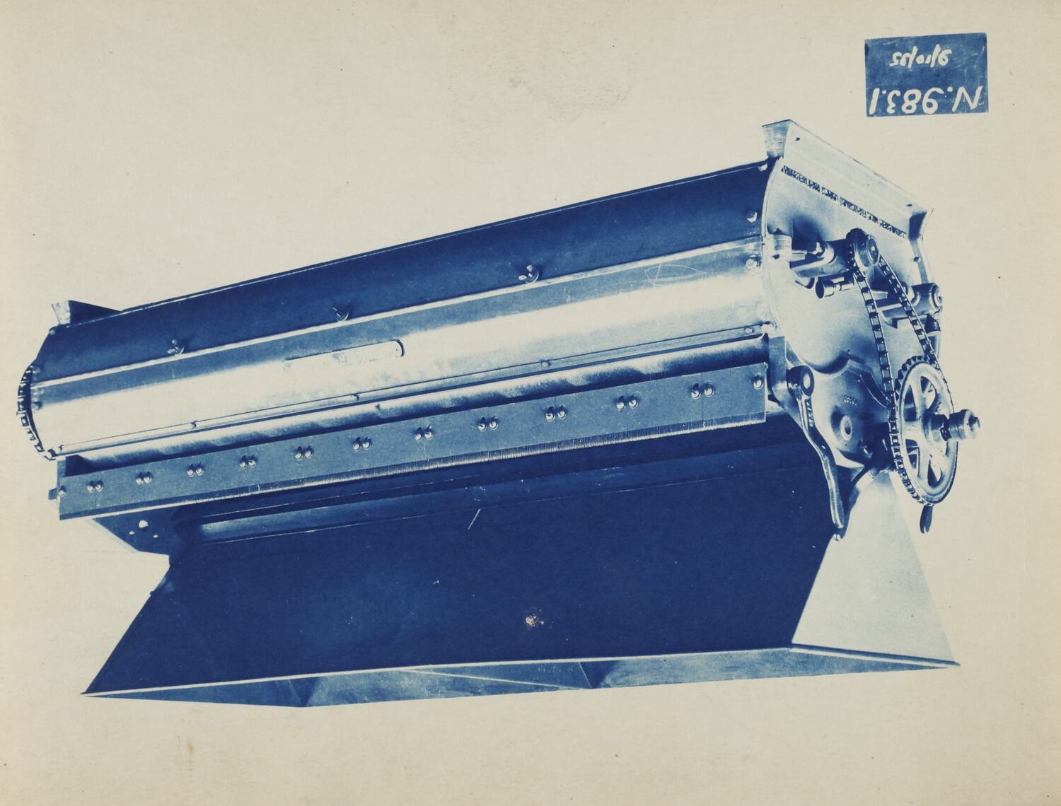 Monochrome promotional image of a brush machine. It is part of a collection of photographs and marked printer's copy used in the preparation of trade literature promoting products manufactured by the Schumacher Mill Furnishing Works Pty Ltd. The items were originally housed in a wooden filing drawer, with many filed by subject. This photograph was previously filed under 'LAYOUTS'.