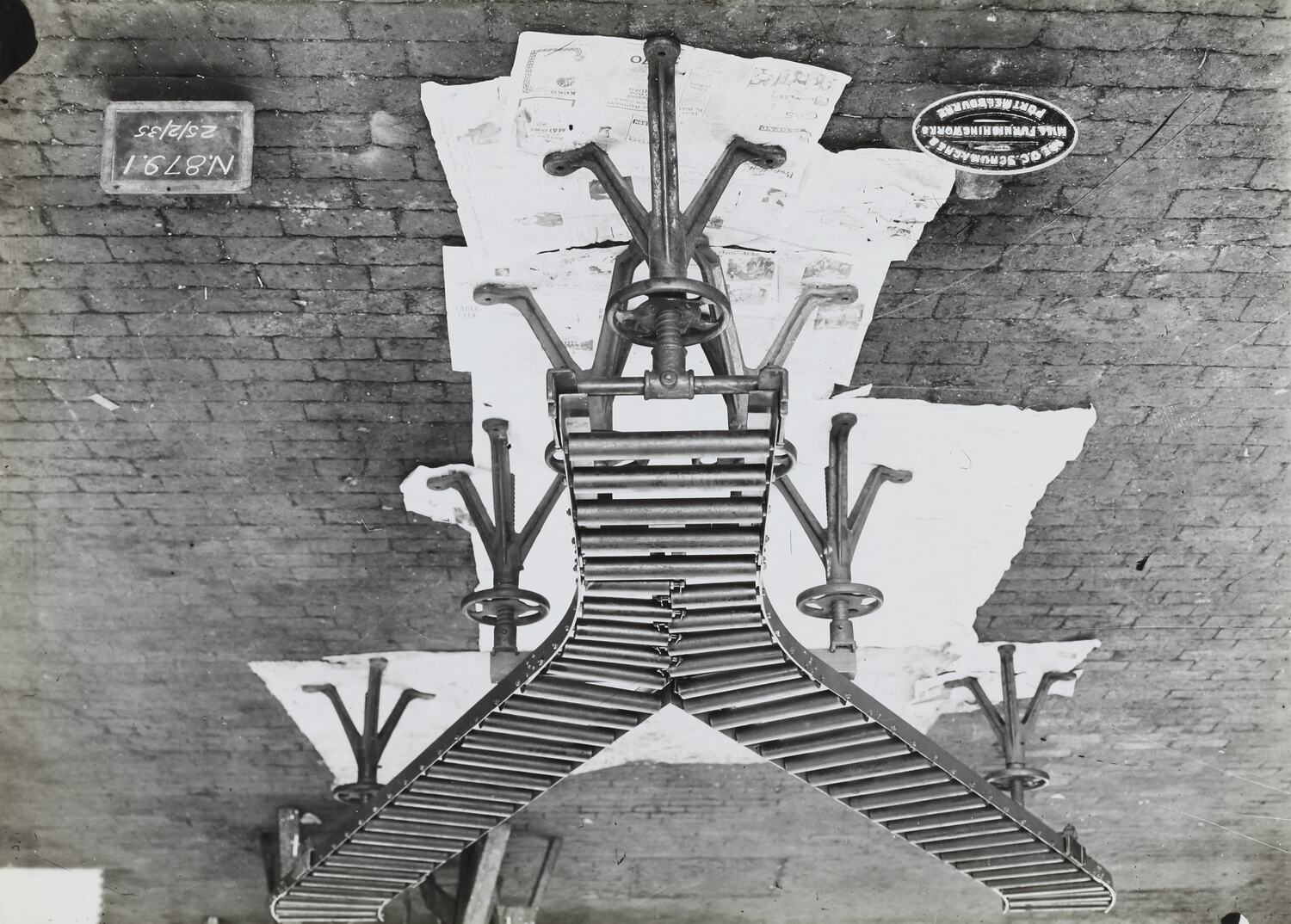 Black and white promotional image of a conveyor. It is part of a collection of photographs and marked printer's copy used in the preparation of trade literature promoting products manufactured by the Schumacher Mill Furnishing Works Pty Ltd. The items were originally housed in a wooden filing drawer, with many filed by subject. This photograph was previously filed under 'LAYOUTS'.