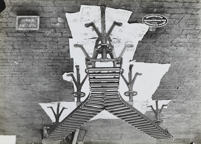 Printed on the front of photograph: 'N.879.1 / 25/2/35' Printed in black ink on back of photograph: 'SCHUMACHER MILL FURNISHING WORKS PTY. LTD. / GRAHAM ST. PORT MELBOURNE. / S. C. 7 VICTORIA. / TELEPHONE MX 2171'