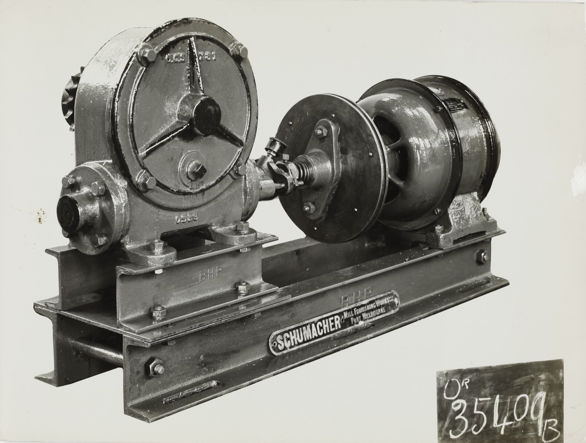 Printed on front of photograph: 'OR / 35409 / B' Printed in purple ink on back of photograph: 'Kerr / BROS. / COMMERCIAL / PHOTOGRAPHERS / 533 COLLINS ST. MELBOURNE' Printed in red ink on back of photograph: 'PHOTO FILE NO / SECTION NO' Hand written in grey pencil on back of photograph: '8' Printed in black ink on cream label attached to back of photograph: 'From / Schumacher Mill Furnishing Works / PROPRIETARY LIMITED. / PORT MELBOURNE, / VICTORIA.' Hand written in black ink on back of photograph: 'No. 2' Hand written text underneath label: [indecipherable]
