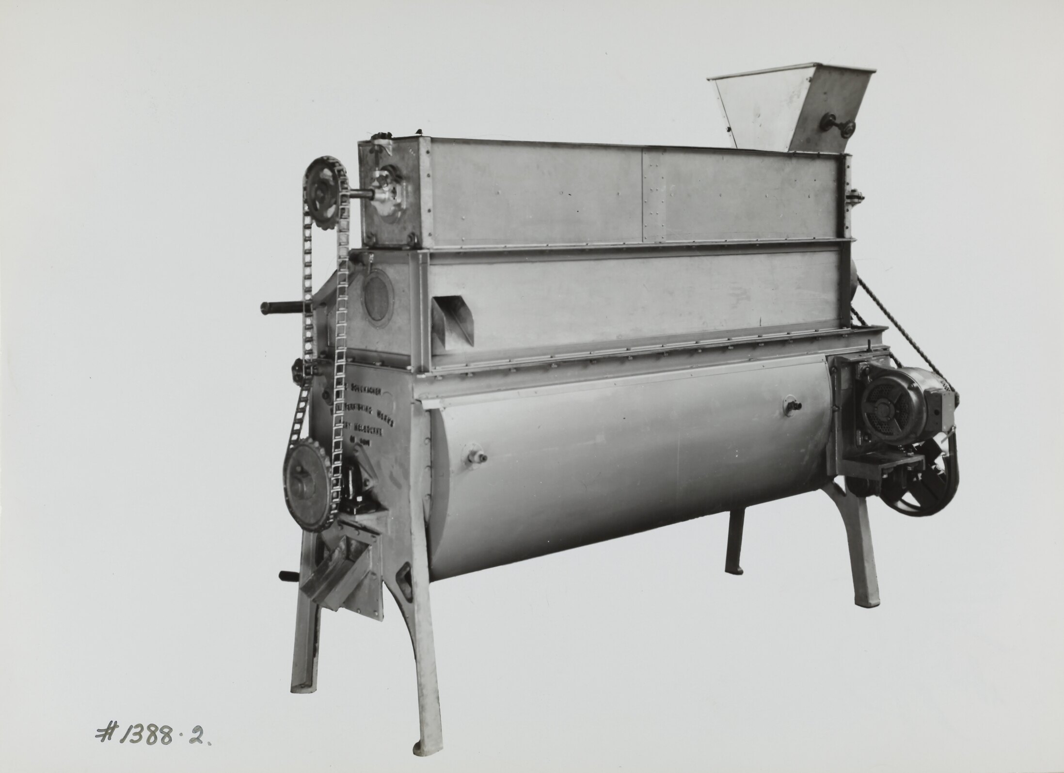 Printed in black on front of photograph: '#1388-2.' Printed in black ink on back of photograph: 'Kerr / BROS. / COMMERCIAL / PHOTOGRAPHERS / 533 COLLINS ST. MELBOURNE' Printed in black ink on back of photograph: 'SCHUMACHER MILL FURNISHING WORKS PTY. LTD. / GRAHAM ST. PORT MELBOURNE. / S. C. 7 VICTORIA. / TELEPHONE MX 2171' Printed in red ink on back of photograph: 'MIXING EQUIPMENT'