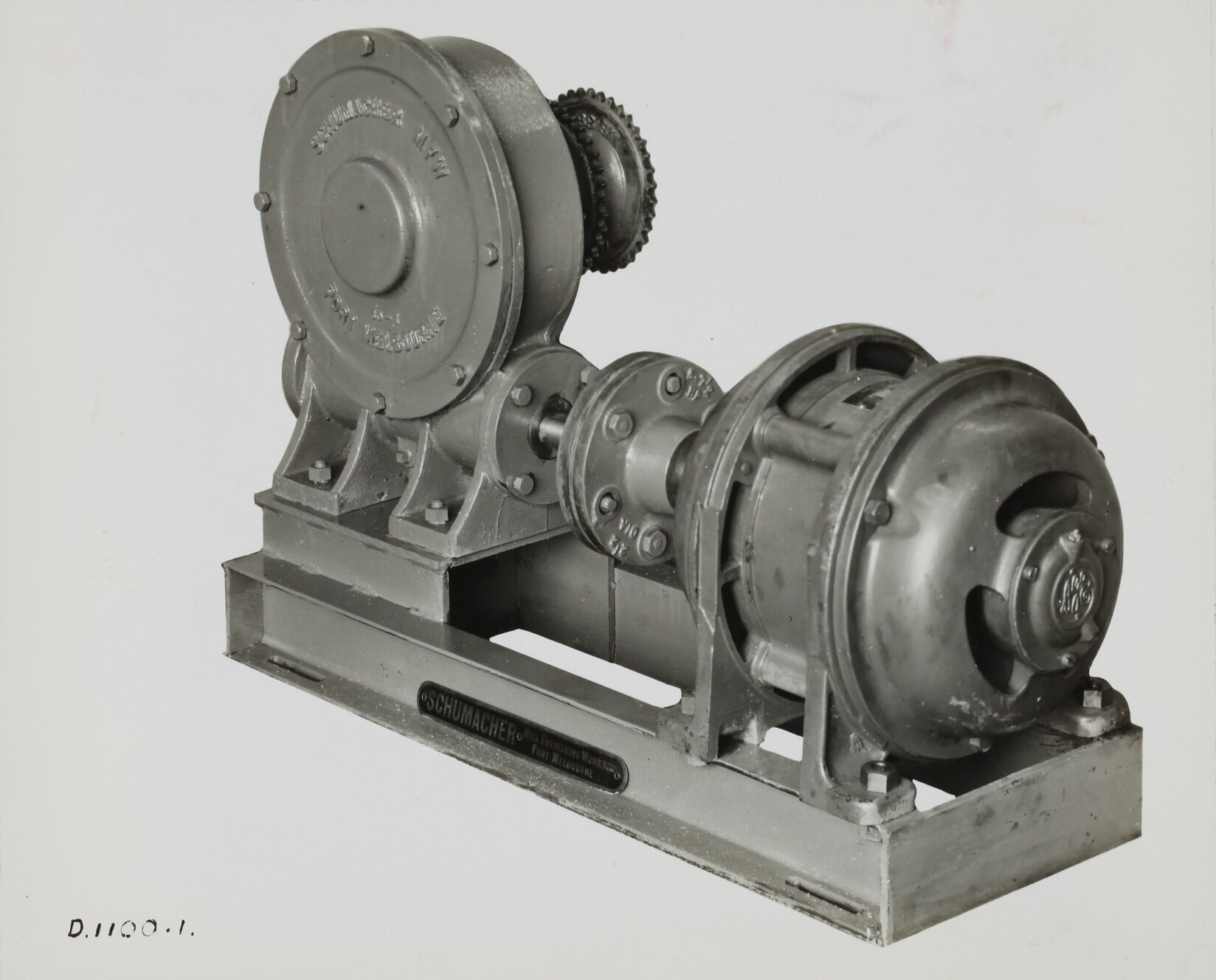Printed in black on front of photograph: 'D.1100-1.' Printed in purple ink on back of photograph: 'Kerr / BROS. / COMMERCIAL / PHOTOGRAPHERS / 533 COLLINS ST. MELBOURNE / Kerr / BROS. / COMMERCIAL / PHOTO' Printed in red ink on back of photograph: 'PHOTO FILE NO / SECTION NO / OFFICE COPY' Hand written in grey pencil on back of photograph: '9' Hand written in black ink on back of photograph: 'No. 3[strikethrough]' Printed in black ink on cream label attached to back of photograph: 'From / Schumacher Mill Furnishing Works / PROPRIETARY LIMITED. / 7 1/2 H. P. DRIVE, SUPPLIED TO / MOUNT MORGAN LIMITED - Q'LAND / O. N. 38790 / 4/9/39. / (SCREW CONVEYING EQUIPMENT) / PORT MELBOURNE, / VICTORIA.'