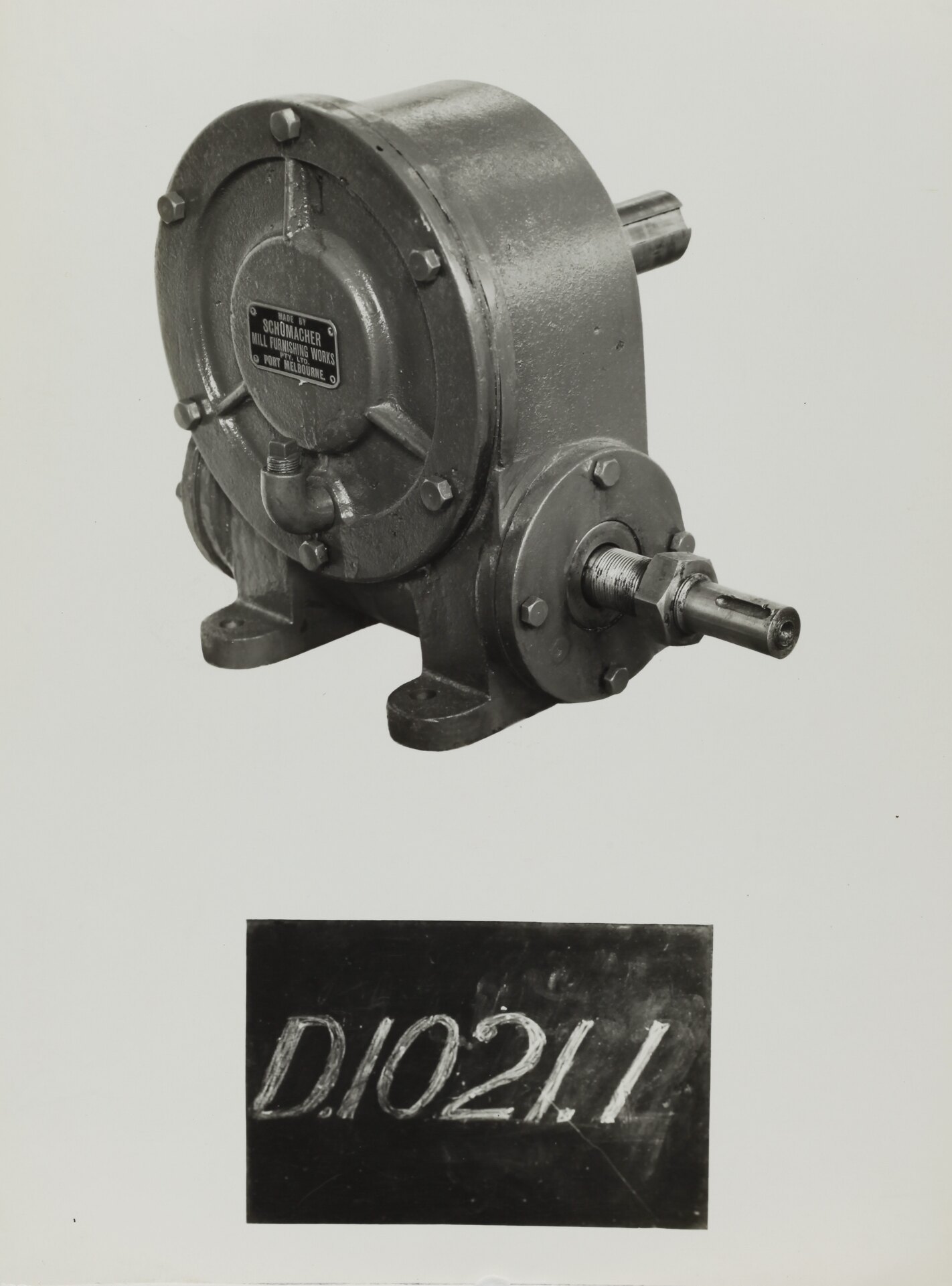 Black and white promotional image of a machine. It is part of a collection of photographs and marked printer's copy used in the preparation of trade literature promoting products manufactured by the Schumacher Mill Furnishing Works Pty Ltd. The items were originally housed in a wooden filing drawer, with many filed by subject. This photograph was previously filed under 'Auger'.