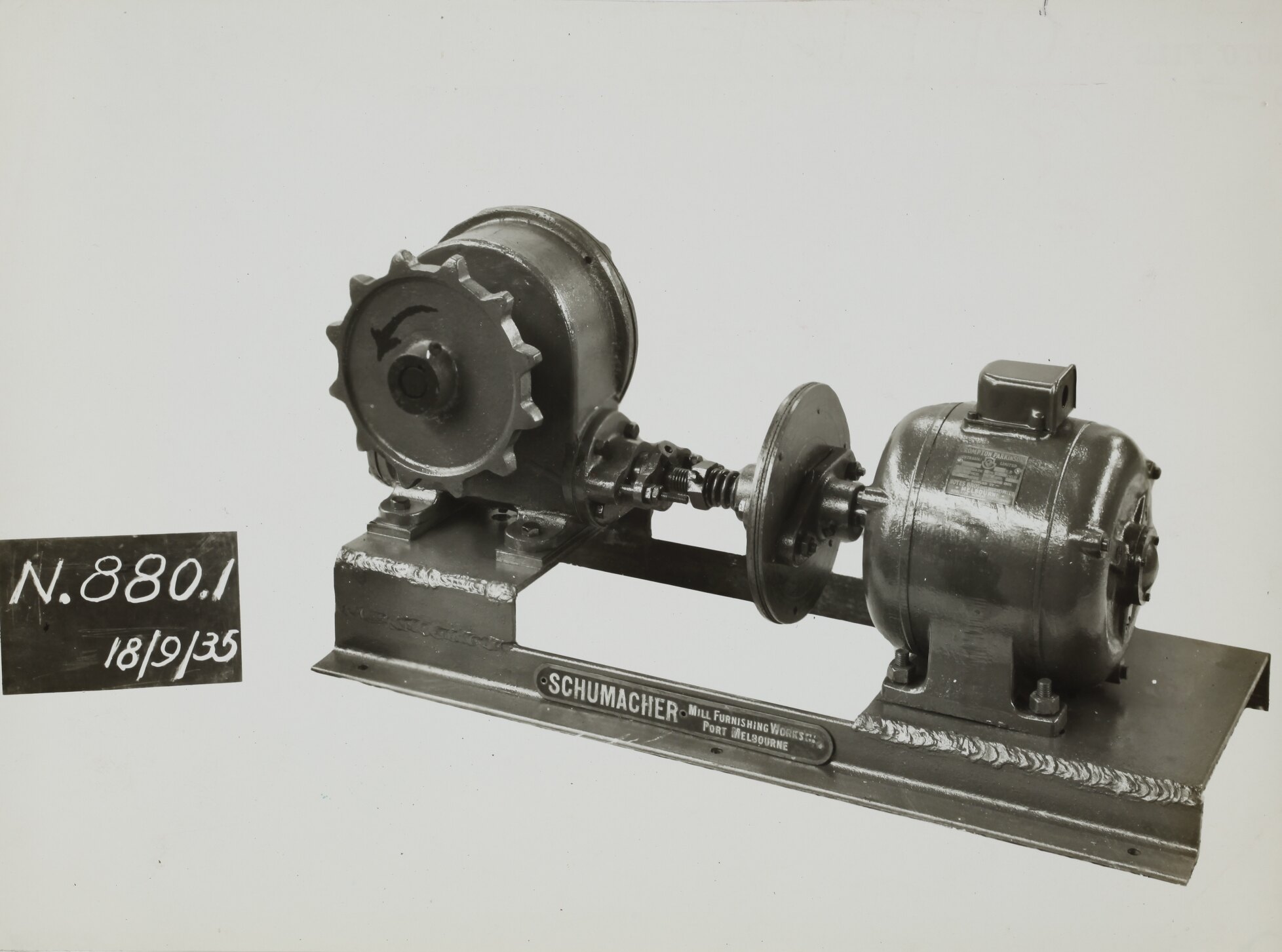 Printed in black on front of photograph: 'N.880.1 / 18/9/35' Printed in red ink on back of photograph: 'PHOTO FILE / NO. / SECTION NO' Hand written in grey pencil on back of photograph: '9 / Gearing / Reduction Gearbox' Hand written in red pencil on back of photograph: 'OFFICE / COPY' Printed in purple ink on back of photograph: 'Kerr / BROS. / COMMERCIAL / PHOTOGRAPHERS / 533 COLLINS ST. MELBOURNE'